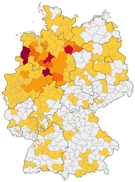 Der Name Grote tritt in Deutschland sehr oft auf, wie man auf der Kartierung erkennen kann.