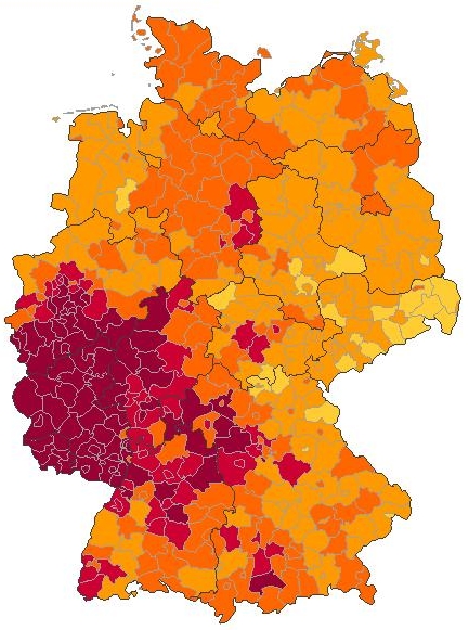 Der Name Klein tritt in Deutschland sehr häufig auf, wie man auf der Kartierung erkennen kann.