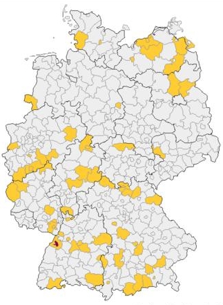 Der Name Schulmeister tritt in Deutschland häufig auf, wie man auf der Kartierung erkennen kann.