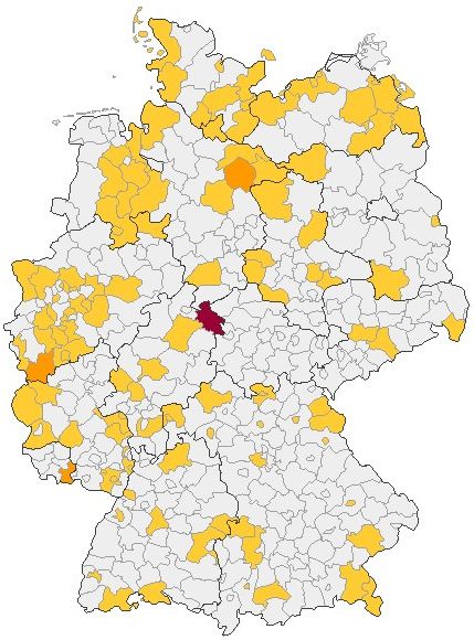 Der Name Steinfeld tritt in Deutschland häufig auf, wie man auf der Kartierung erkennen kann.
