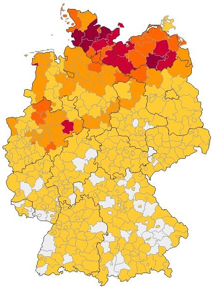 Der Name Voß tritt in Deutschland sehr häufig auf, wie man auf der Kartierung erkennen kann.