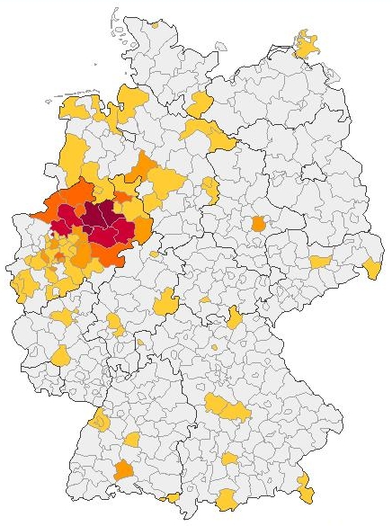 Der Name Westhoff tritt in Deutschland häufig auf, wie man auf der Kartierung erkennen kann.