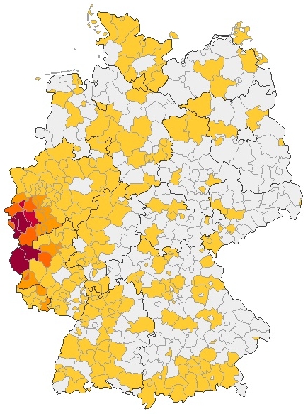 Der Name Wirtz tritt in Deutschland häufig auf, wie man auf der Kartierung erkennen kann.